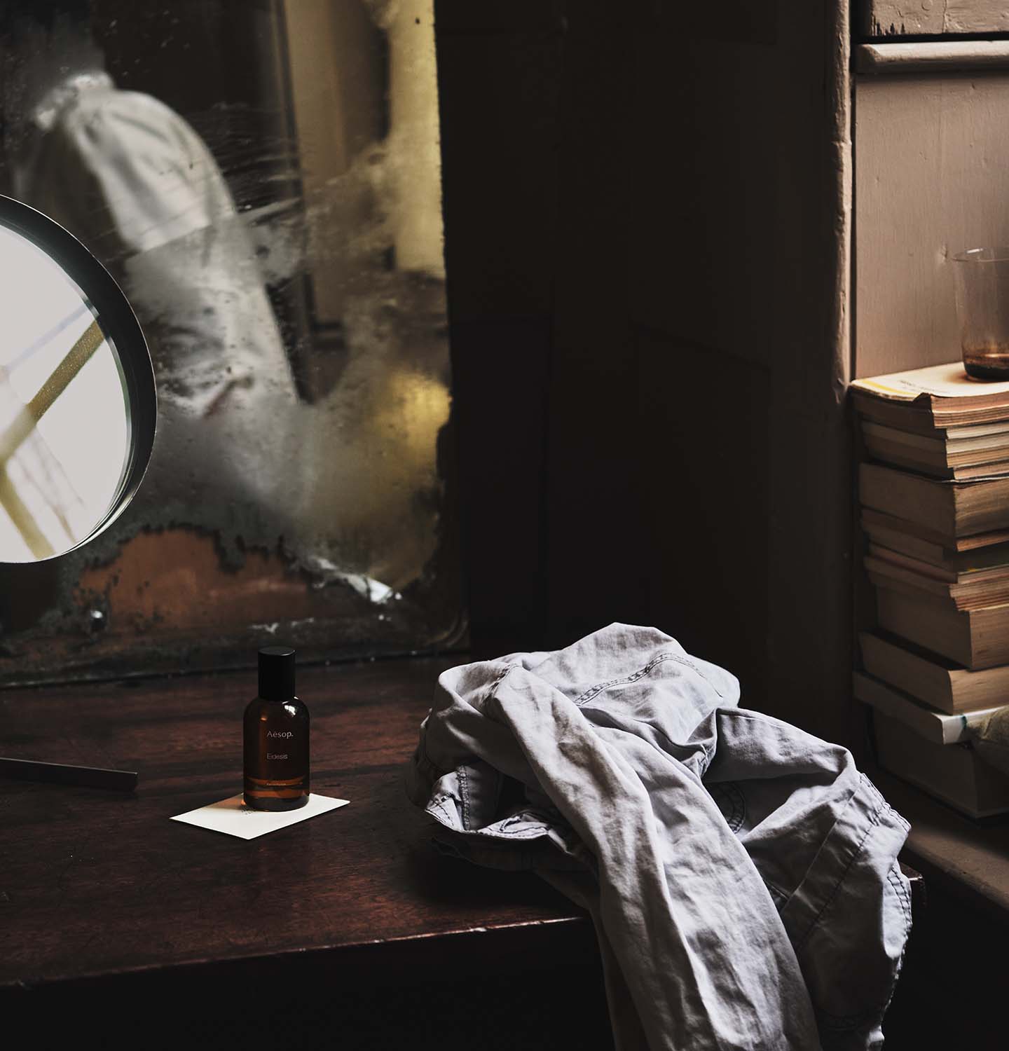 A beguiling fragrance that emulates the imaginary world beyond the surface of a mirror—bright opening notes developing into deep spice, damp earth and dry woods.
