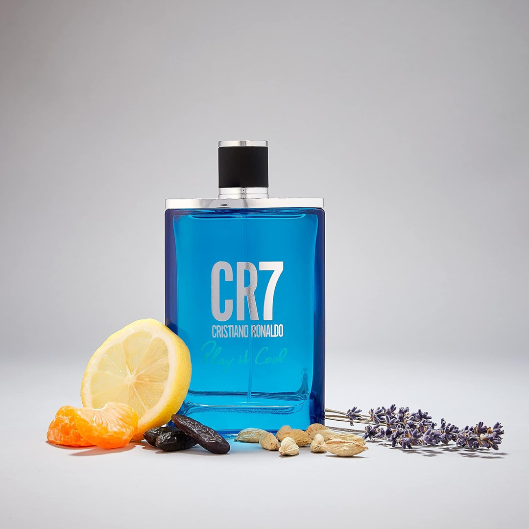 CR7 Play It Cool EDT smells like a fresh, spicy, and aromatic blend with cool blue elements, reflecting Ronaldo's sophistication.