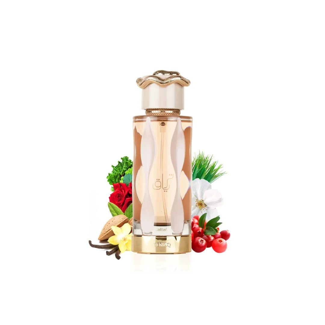 As the fragrance evolves, it reveals a sensual heart of honey intertwined with rhubarb and white flowers, deepening into a warm, entrancing base of vanilla, leather, and musk. Lattafa Teriaq EDP leaves a captivating trail that is both sophisticated and unforgettable.
