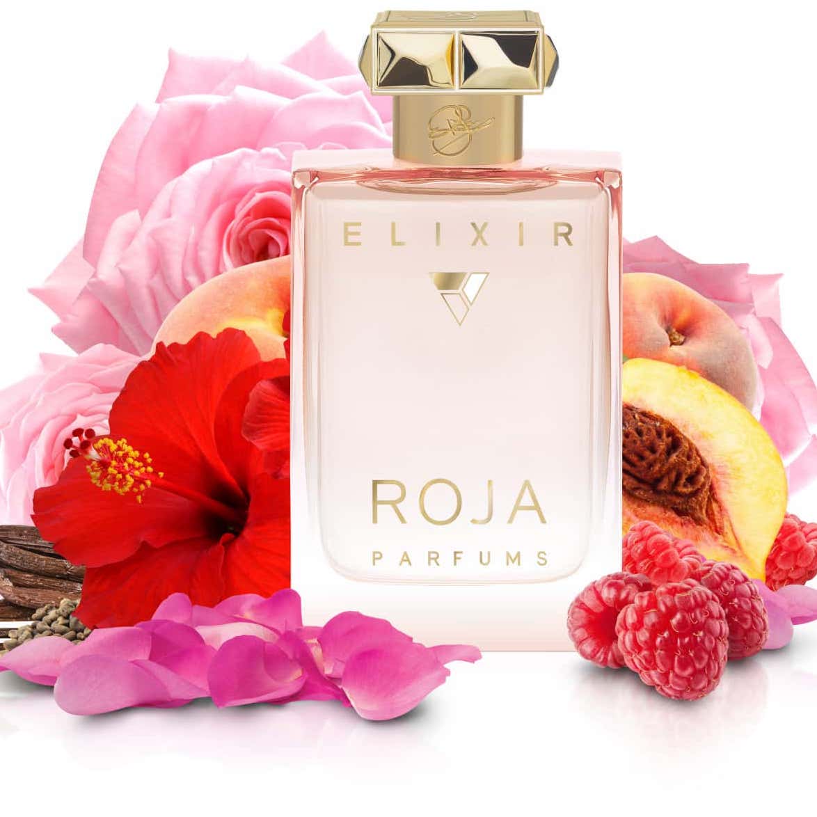 Roja Parfums Elixir Parfum has a fruity floral scent with bergamot, raspberry, rose, and peach notes.