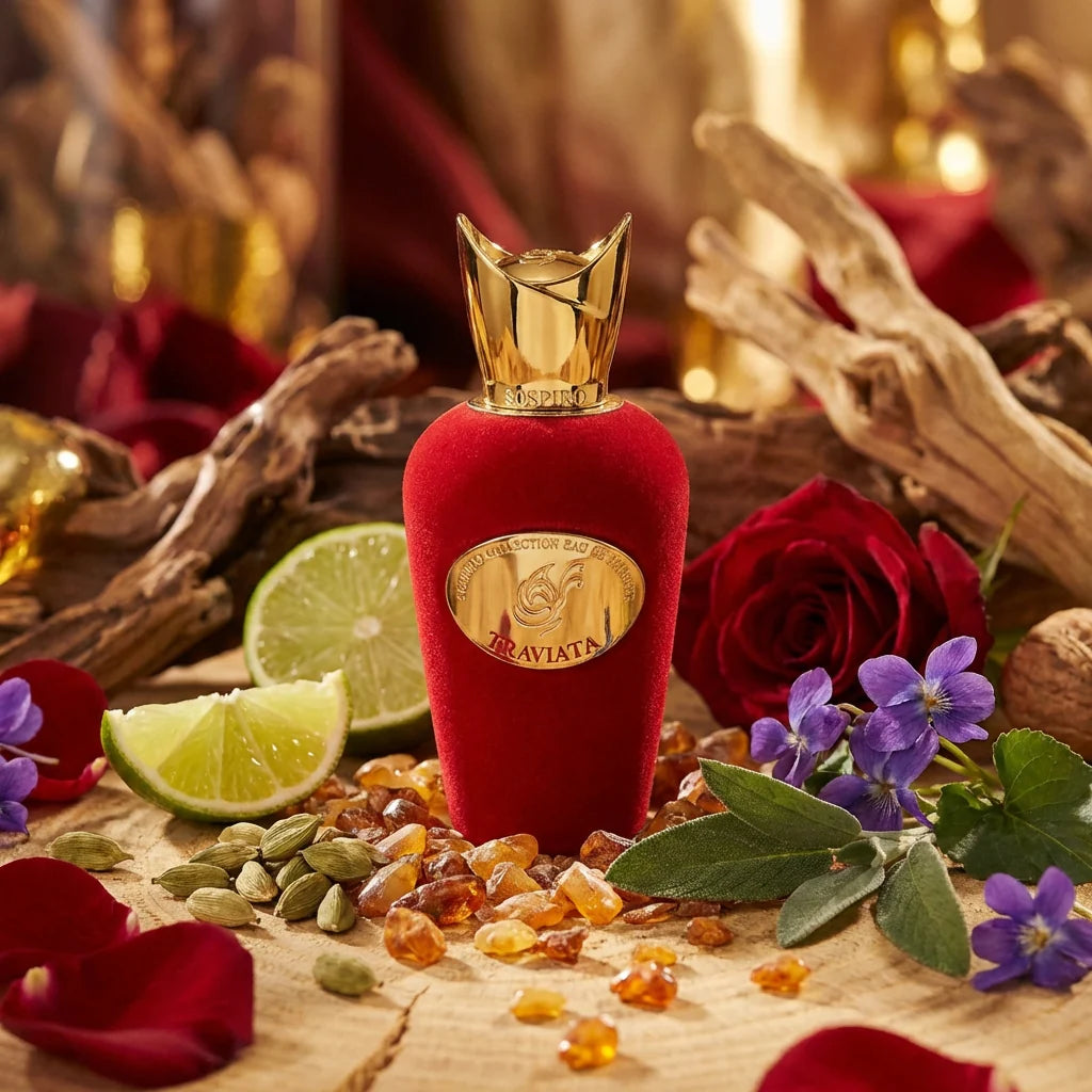 Sospiro Traviata EDP is an opulent fragrance that weaves aromatic herbs, lush florals, and warm woods into a refined composition. It balances citrusy brightness and spicy depth for a dramatic, elegant presence.